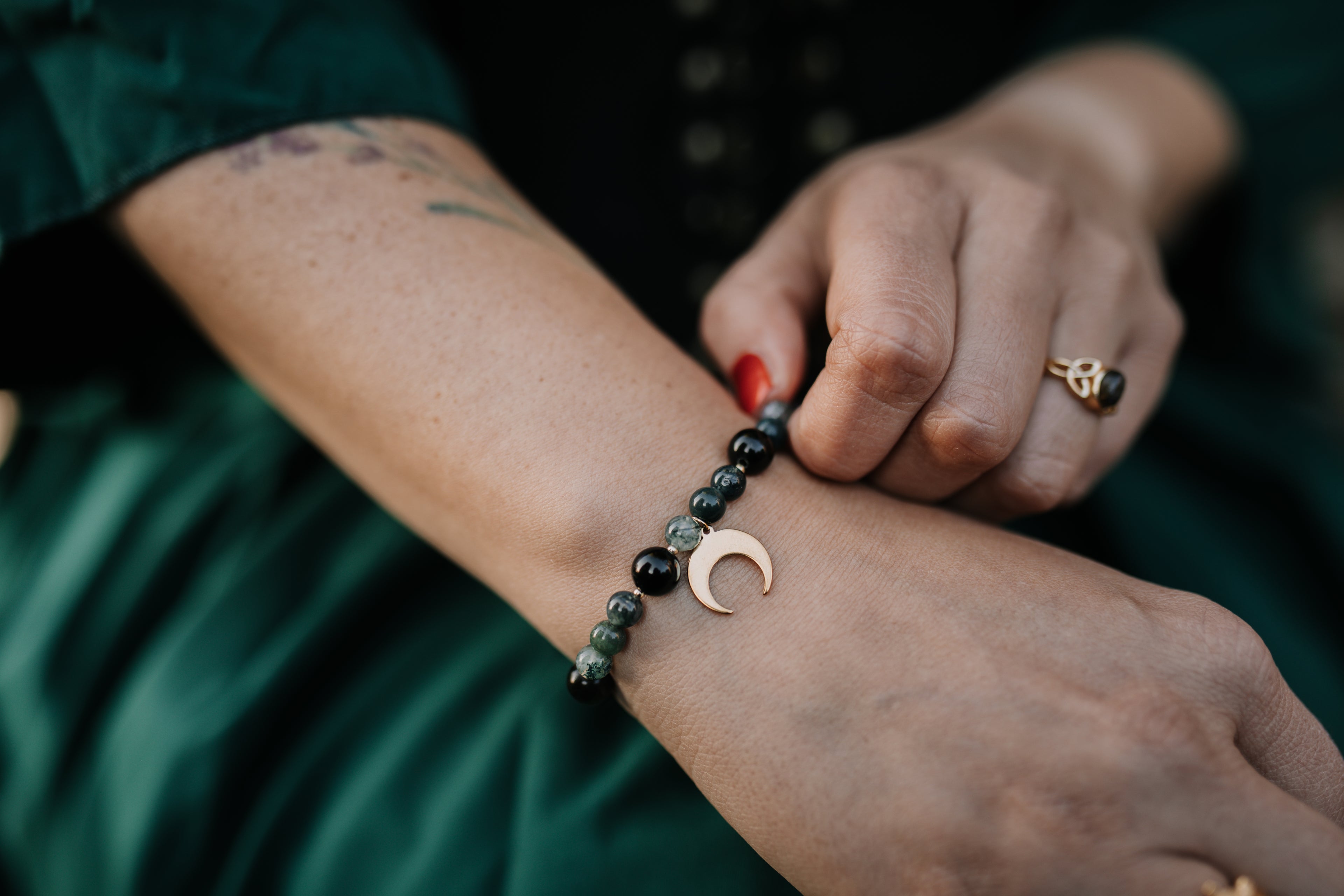 Armband "Nocturnis" | Moosachat - Obsidian | Silber & Gold | Edelstahl