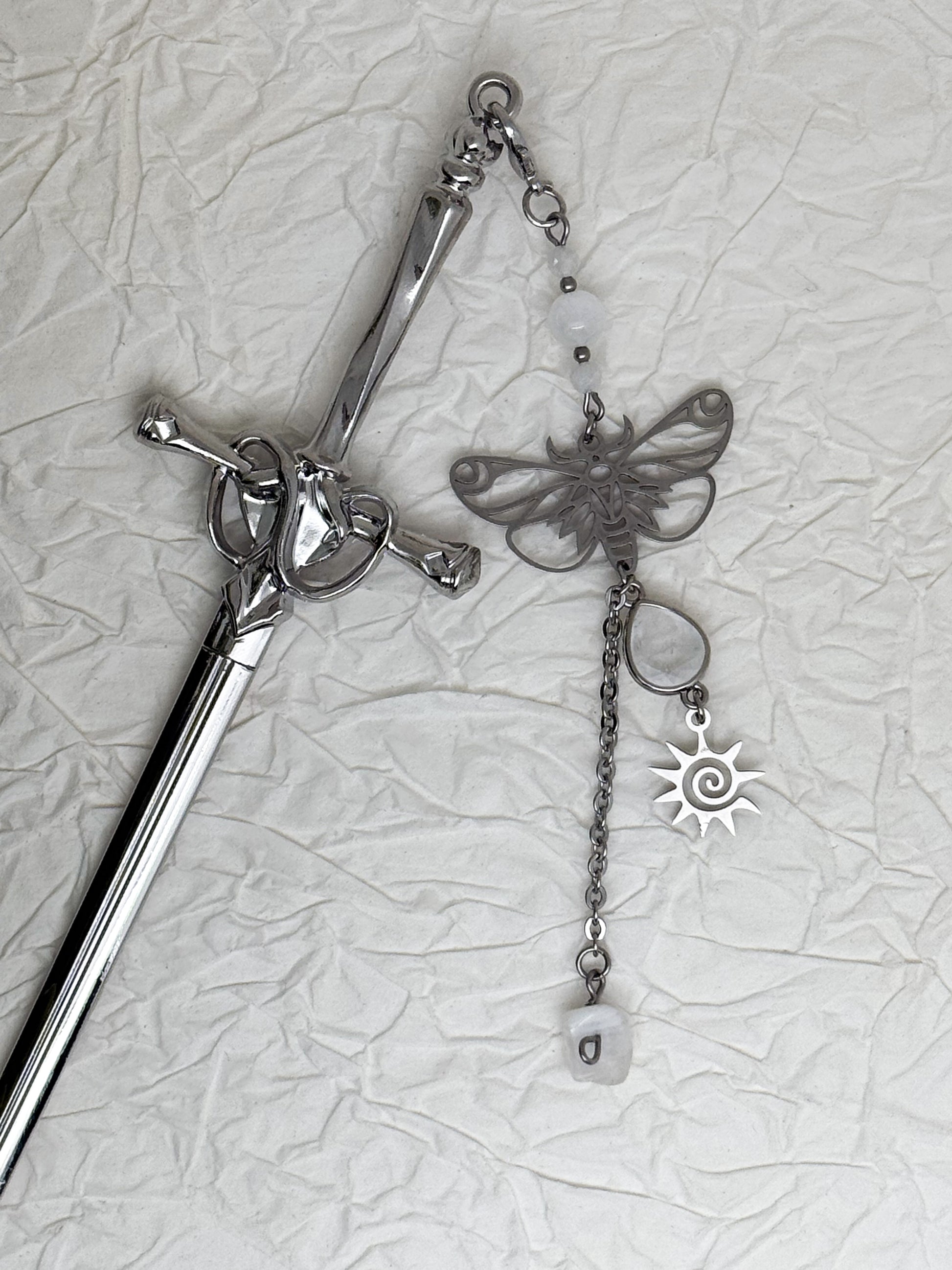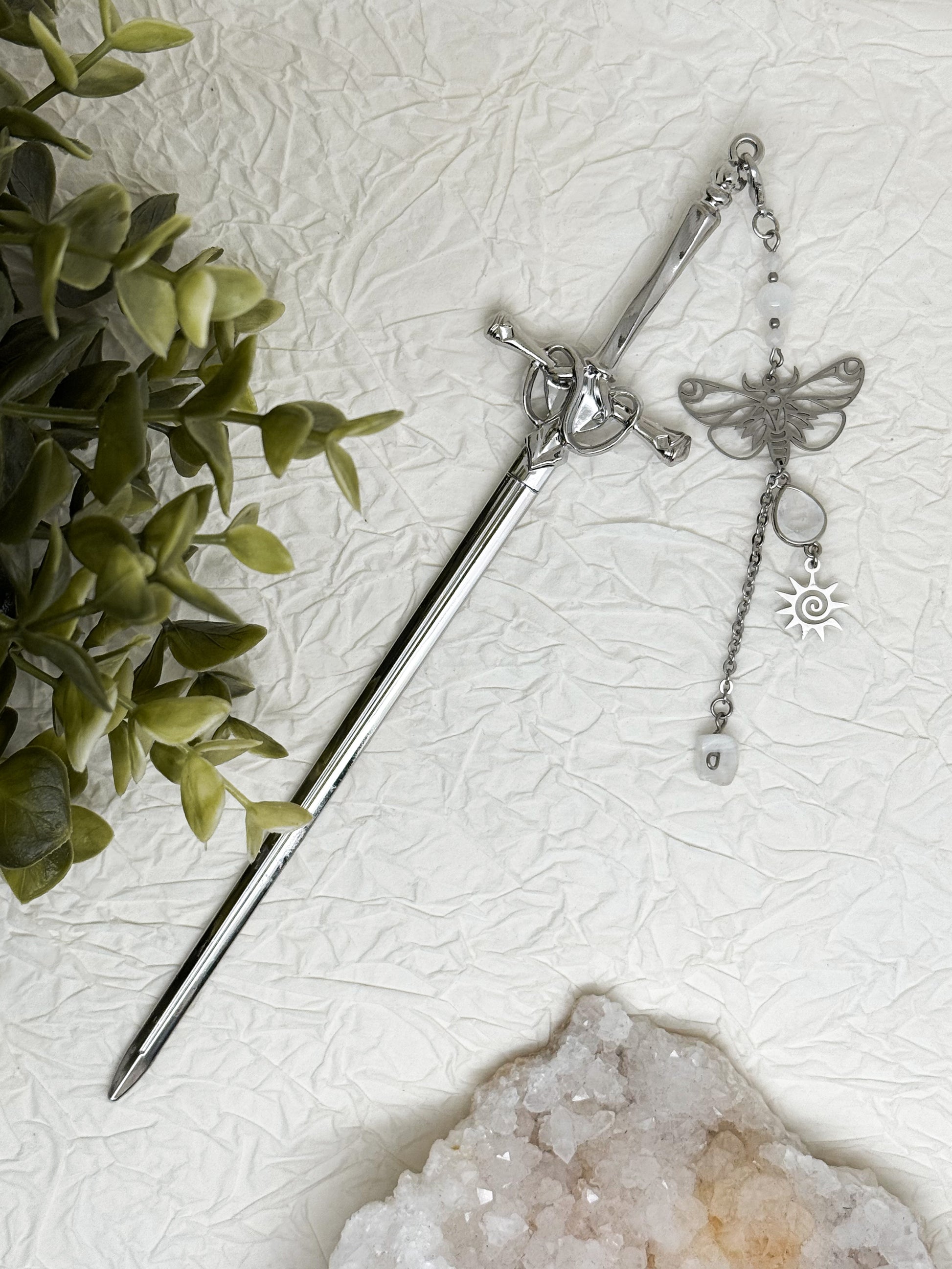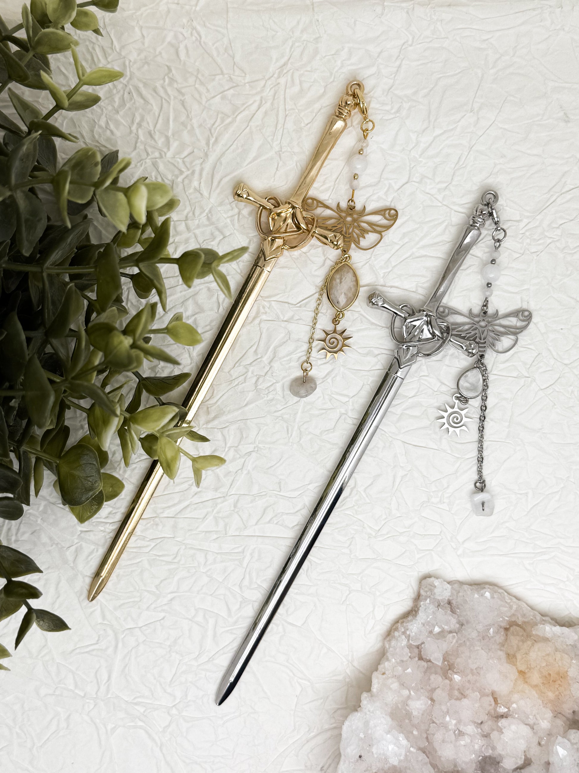 Schwert Haarnadeln mit Sonnenstein, Mondstein und Bergkristall | Gold & Silber