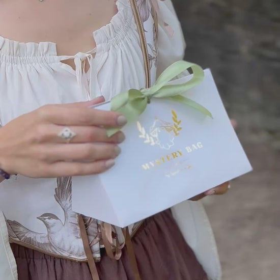In der kleinen Mystery Bag (für 25€) bekommst du komplett zufälligen Schmuck, ohne Wunschangaben. Es ist immer ein Paar Ohrringe und eine Kette aus der Sale Kategorie enthalten. Du bezahlst nur 35€ für einen Wert von 40€ - 50€. Umtausch ist ausgeschlossen bei Schmuckstücken aus einer Mystery Bag.